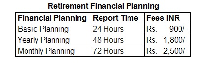 All you have to do is submit us the query form on this website written ‘Retirement Planning required and make payment of amount to us by cheque at IDBI Bank in favour of ‘Anand Consultants‘ in to our Current A/c. No. 1115102000008792 (according to the plan you select from the schedule given below). You will receive our Data Filling Form for Retirement Planning on your Email. Complete it with as much correct information as you can get and possibly attach with it the supporting documents (scanned), which will enable us in assessing your correct financial standing. You shall receive your authentic Retirement Plan tentatively within 24 hours for Plan Ret. A, 48 hours for Plan Ret. B and 72 hours for Plan Ret. C of working days. (After complete data received).